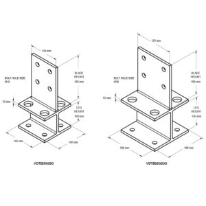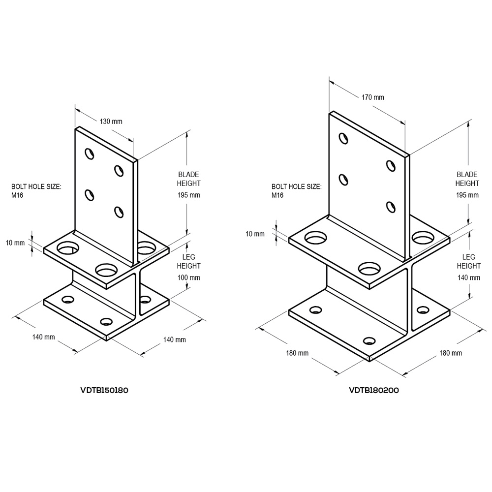 | VDTB150180 | 140mm x 140mm Base - 195mm Blade - 100mm Leg | 10.0mm | M16 | 1 |