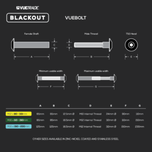 VUEBOLT BLACKOUT Post Support Bolts are concealed thread bolts ideal for fixing post supports with a quick, neat and concealed finish with black powder coated dome heads.